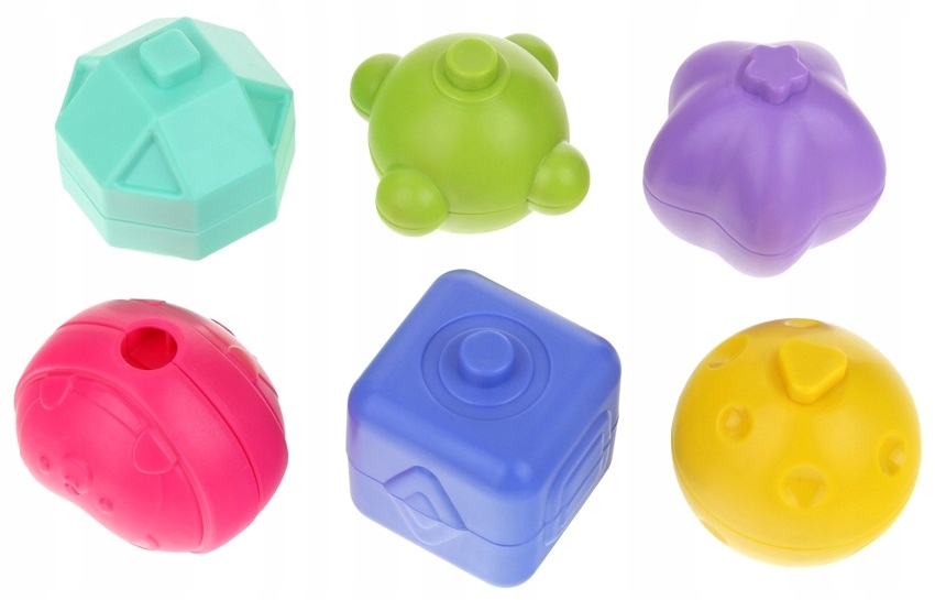 - KLOCKI SENSORYCZNE - w zestawie 6 klocków o różnych kształtach, kolorach i fakturach. Oprócz tego, że służą do wkładania ich do sortera, można z nich również wybudować wieżę oraz posłuchać jak grzechoczą.