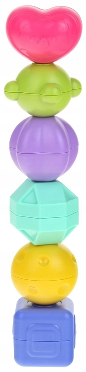 W zestawie jest 6 klocków - każdy ma inny kształt, fakturę i kolor, co rozbudza ciekawość i zachęca do zabawy. Każdy z klocków to równocześnie grzechotka, dzięki czemu stymulowany jest zmysł słuchu, można z nich zbudować wieżę oraz wkładać i wyjmować z sortera, przeciskając je przez elastyczne sznureczki lub dopasowując do otworów o odpowiednim kształcie.