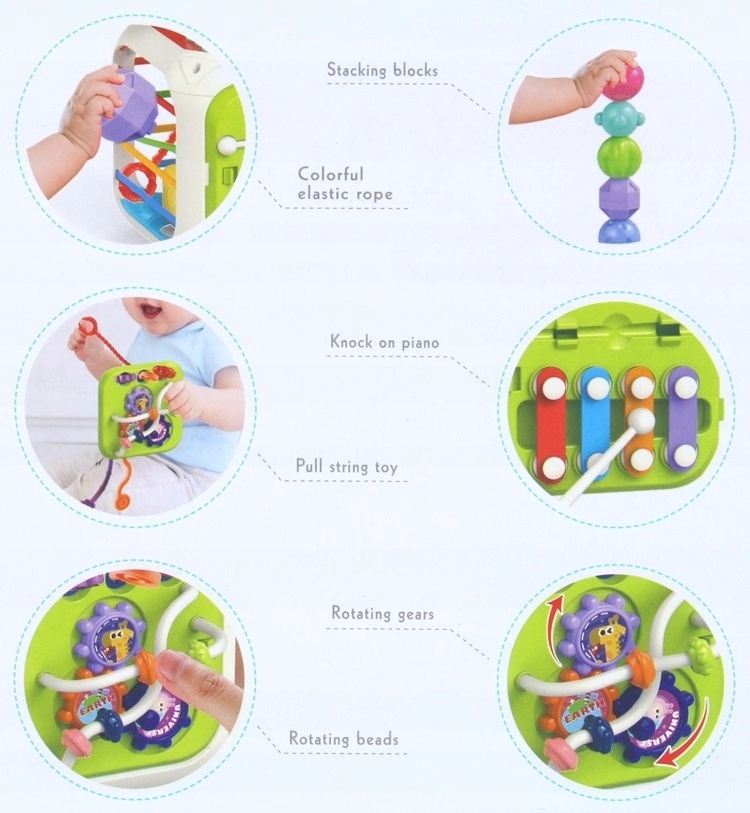 Zabawka stymuluje zmysły dziecka, wspomaga rozwój manualny oraz naukę rozpoznawania kształtów i kolorów.