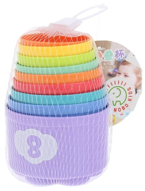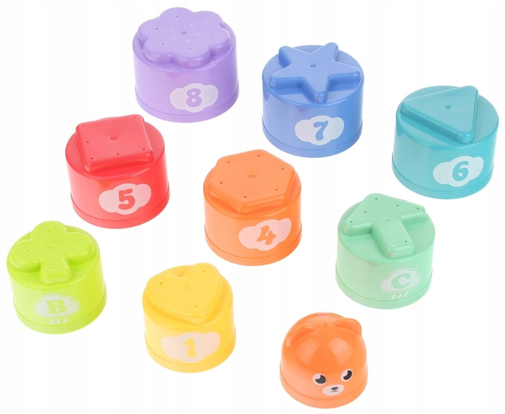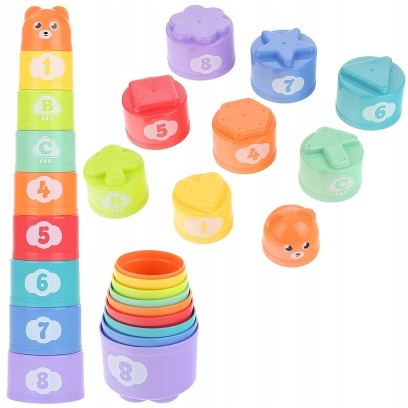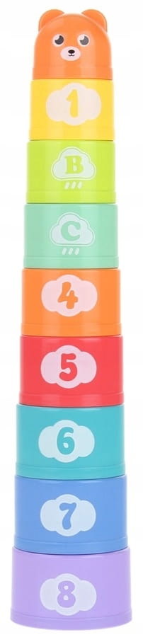 Piramidka składająca się z 9 kolorowych kubeczków o różnych kolorach, wymiarach i kształtach na ich powierzchni. Dziecko może tworzyć piramidkę przez układanie kubeczków jeden na drugim, a każdy z nich ma na spodzie różny kształt więc piramidka idealnie nada się do nauki pierwszych figur, czy też kształtów.