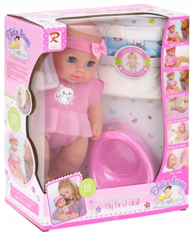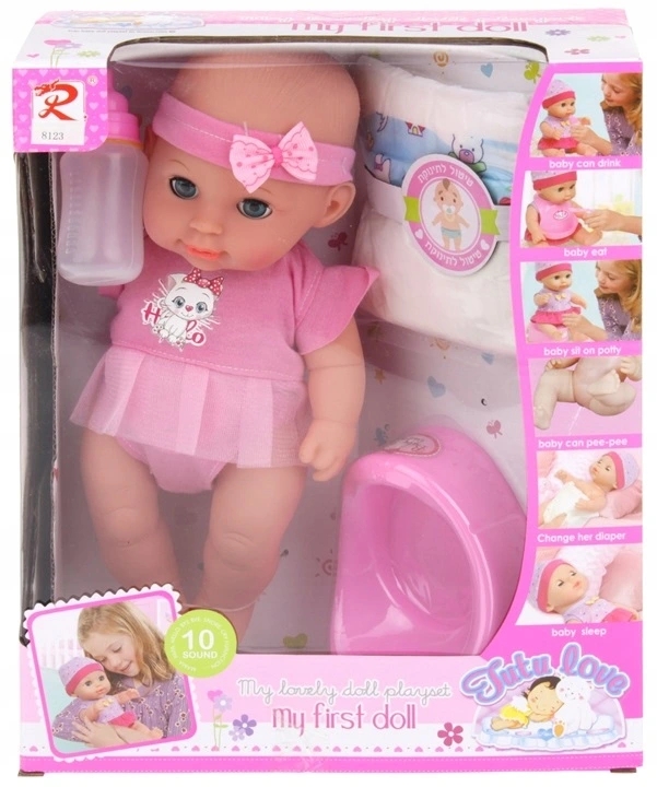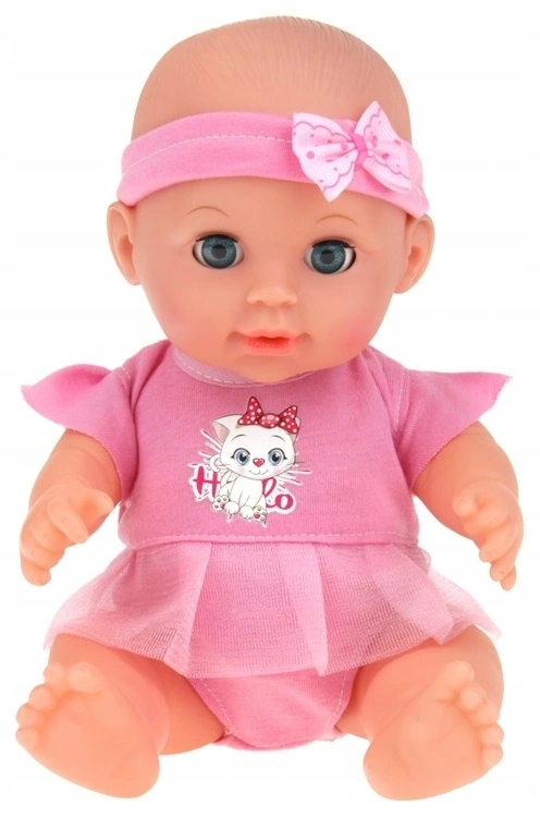 ✔️ Lalka mówi – po naciśnięciu brzuszka usłyszysz 10 dźwięków: mama, tata, śmiech, płacz, gaworzenie i inne.