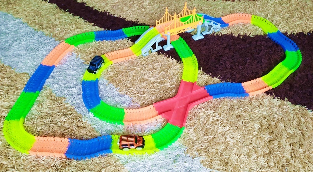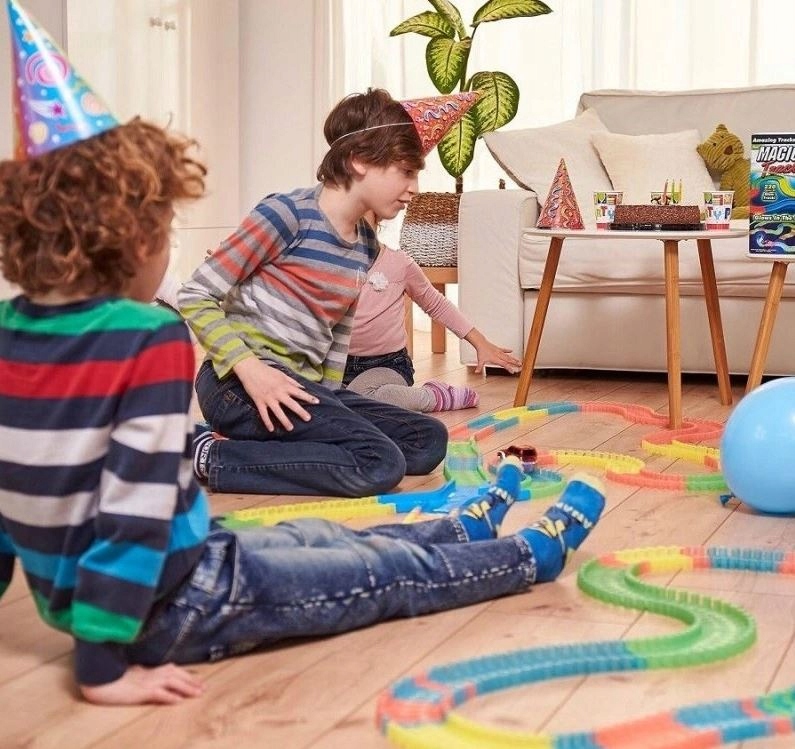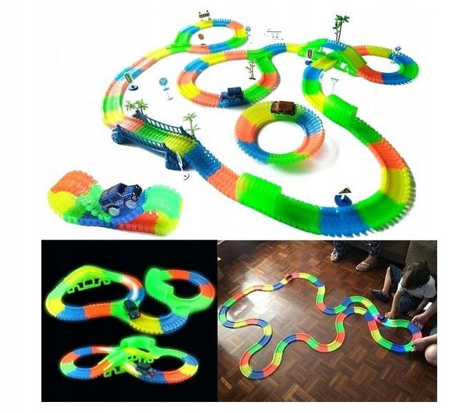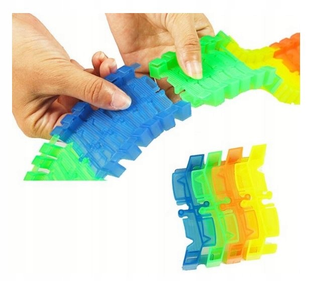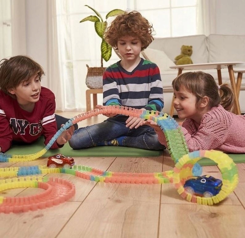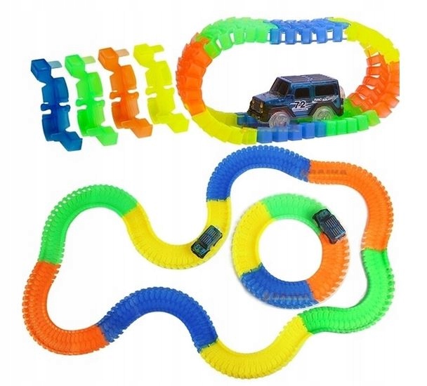 Zestaw Magic Track to elastyczny tor o długości aż 450 cm, który możesz dowolnie wyginać, obracać i zmieniać jego kształt nawet podczas jazdy samochodów! W komplecie znajdują się 2 autka LED, które samodzielnie poruszają się po trasie, tworząc niesamowity efekt świetlny.