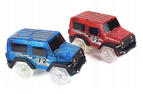 2 samochody z diodami LED – zasilane 1 baterią AAA (brak w zestawie), samodzielnie poruszają się po torze.